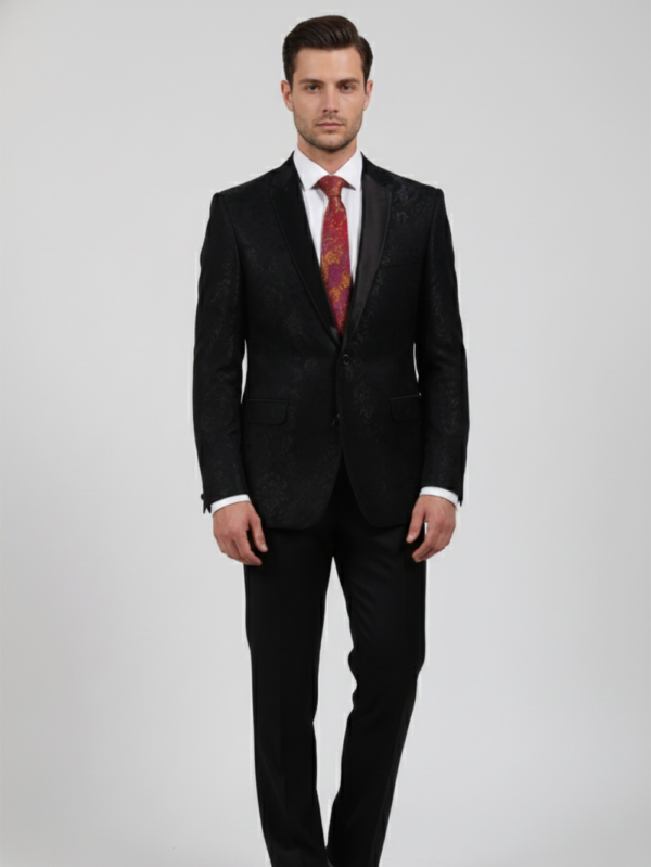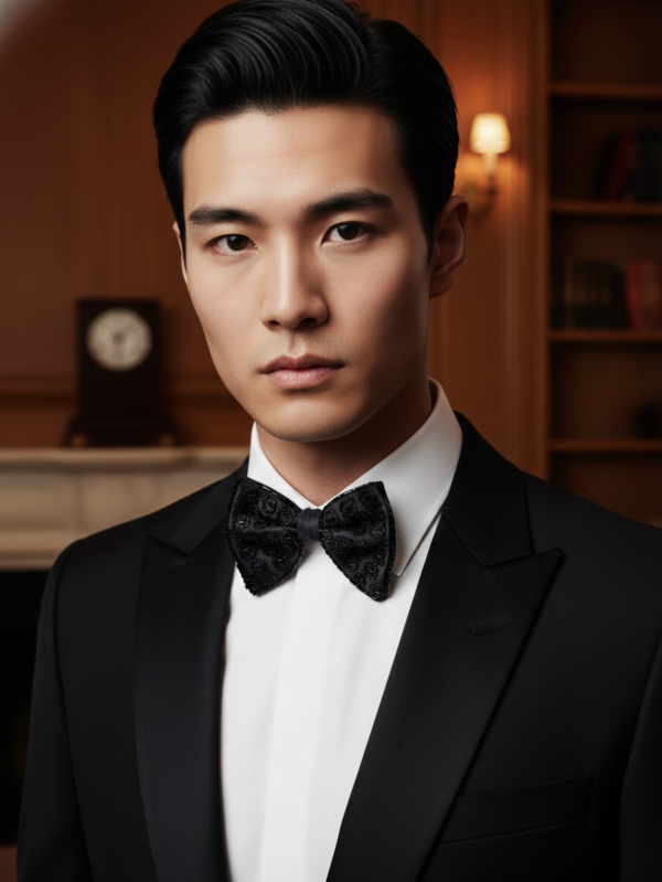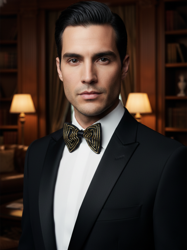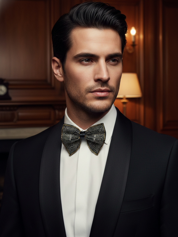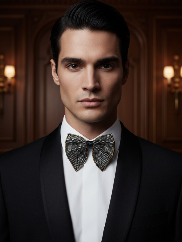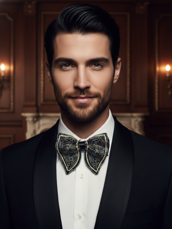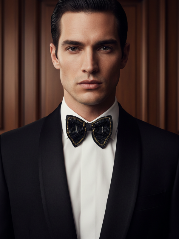 Black Satin Bow Tie with White Beaded Detailing - Premium Formal Wear Accessory