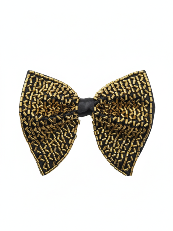 ● Radiant Gold Embroidery: Meticulously hand-beaded with premium metallic gold tube beads. ● Dynamic Light Reflection: The scattered pattern ensures a brilliant shimmer from every angle. ● High-Contrast Aesthetic: The vivid gold against deep black provides a classic yet high-impact look. ● Perfectly Pre-Tied: Expertly knotted for a sharp, symmetrical silhouette that lasts all night. Signature Craftsmanship: Individually handcrafted to ensure artisanal quality and attention to detail.