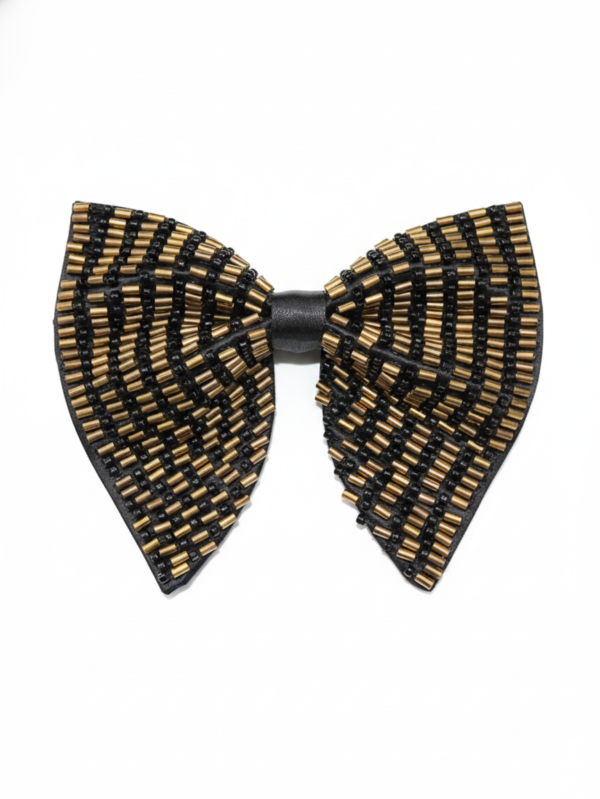 ● Signature Butterfly Cut: Features wider, flared wings for a bold and sophisticated profile. ● Artisanal Beadwork: Intricately hand-set with silver and gold-tone metallic bugle beads. ● High-Contrast Texture: A luxurious blend of shimmering glass beads against a smooth black satin backing. ● Versatile Fit: Includes an adjustable neck strap to accommodate all collar sizes comfortably. ● Event-Ready: The ultimate statement piece for black-tie events, weddings, or avant-garde styling.