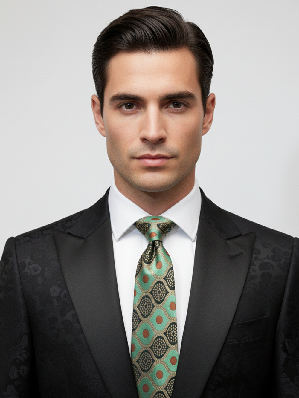 Stand out with this eye-catching tie featuring a rich combination of dark and light green shades, accented by playful red dots. Perfect for adding a pop of color to your formal or semi-formal attire, this tie balances bold style with subtle sophistication. It pairs well with neutral or dark-colored suits, making it a versatile accessory for both office and festive occasions.