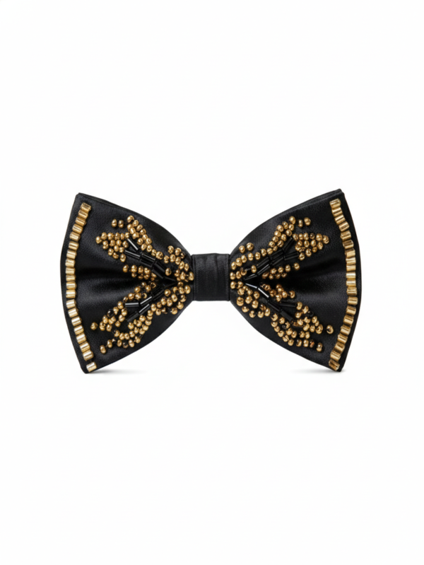 Black Satin Bow Tie with Gold Beaded Embellishments Luxe Formal Accessory