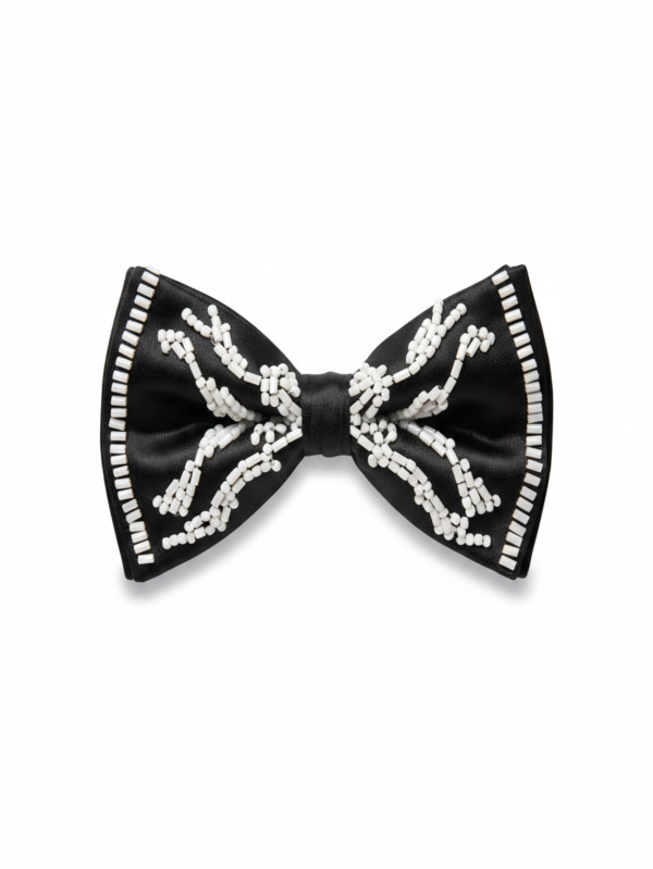 Black Satin Bow Tie with White Beaded Detailing - Premium Formal Wear Accessory